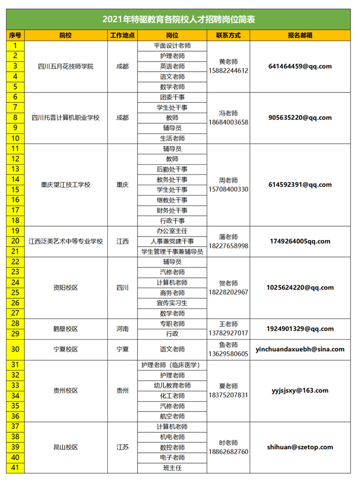 報名:應(yīng)聘人員將簡歷、本人身份證、畢業(yè)證、學位證、職業(yè)資格證、近期電子照片等材料的電子掃描件,以PDF形式分別發(fā)送至各院校聯(lián)系人的電子郵箱(請從《2021年特驅(qū)教育各院校人才招聘崗位簡表》中查看郵箱地址),郵件主題以應(yīng)聘崗位+本人姓名+職稱+專業(yè)命名。資格審核與面試:對收到的應(yīng)聘材料進行資格審查,審核通過者,將擇期通知面試。面試分為初試和復試,復試通過后錄用。